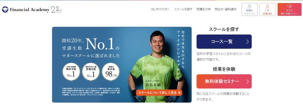 次にご紹介するのは、「ファイナンシャルアカデミー」です。「お金の学校」をテーマにするファイナンシャルアカデミーは、投資や家計管理など、お金に関する幅広い知識を身につけることができるスクールです。