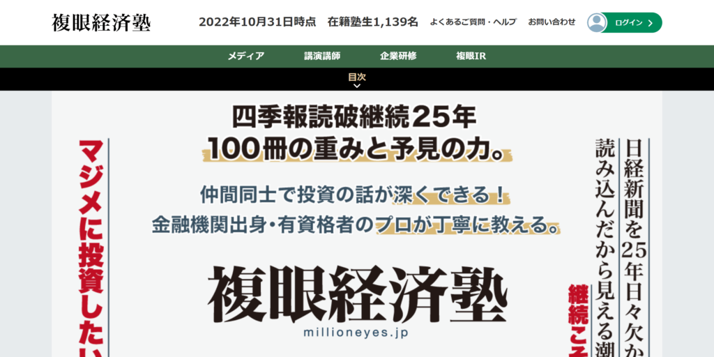 社名:複眼経済塾株式会社 住所:〒162-0843 東京都新宿区市谷田町3-13 神楽ビル3階 TEL:03-6280-8451 今回紹介する複眼経済塾は四季報を重視した企業分析をモットーとする投資スクールです。企業分析